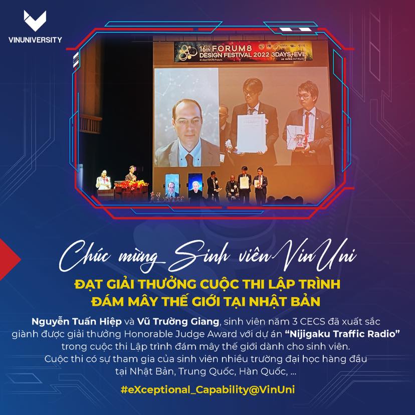 Moreover, Nguyen Tuan Hiep and Vu Truong Giang, third year students from CECS, won the Honorable Judge Award with their project “Nijgaku Traffic Radio” in the Cloud Programming World Cup for students in Tokyo, Japan on November 17th.