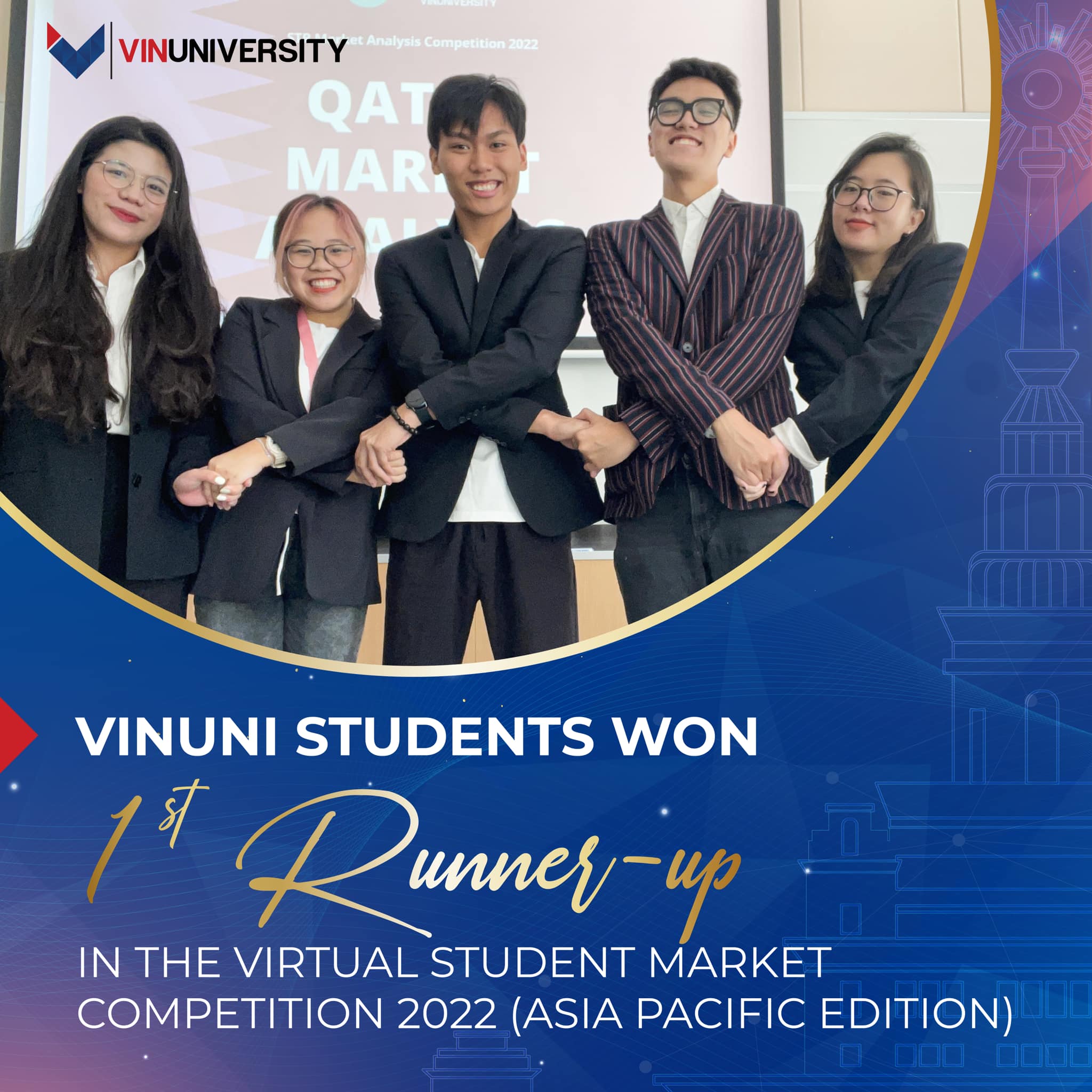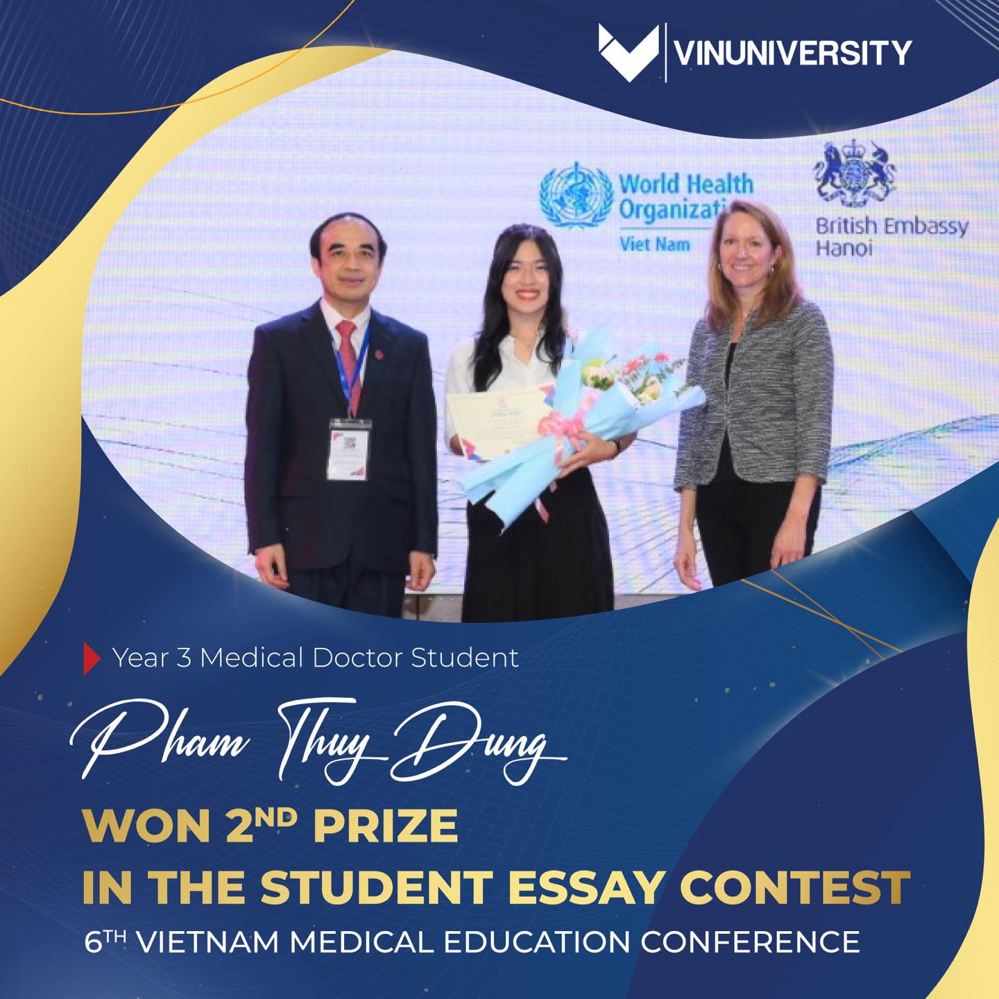 VinUni believes that the success of its students is the success of the university itself. In November, VinUni students had received numerous prestigious awards: Nguyen Thi Thanh Hang, Nguyen Thi Ngoc Thao, Nong Duc Anh, Hoang Phuong Thao and Le Trung Kien – majoring in Hotel Management at College of Business and Management (CBM) – won Second Place for Asia-Pacific region at the Virtual Student Market Competition; Nguyen Thi Thuy Ngan, a Nursing student, had the honor of receiving an Encouragement Award for her report on “Improving Physical Activity and Symptom Management for Vietnamese Women After Cancer Treatment” at the 10th National Science Conference for Nursing; Pham Thuy Dung, a third-year medical student at CHS, also won Second Place in this year’s Student Essay Competition.