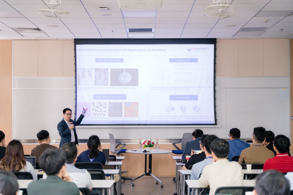 Dr. Hieu then guided the audience through the journey of bringing AI “out of the laboratory and into real life” with a series of research projects being conducted at VinUni. In early disease detection, his team is developing a stroke detection system using only facial and voice data — a model currently being tested with real-world datasets. In cellular analysis, the Virtual Staining project, in collaboration with Seoul National University, enables digital staining of microscope images using GAN and Latent Diffusion Models, helping to shorten diagnostic workflows and reduce research costs. Meanwhile, the Cardiac Digital Twin and Edge AI for Maternal Health projects are introducing new approaches in cardiology and obstetrics — from simulating 4D heart motion for improved diagnosis to creating wearable AI devices for continuous fetal heart monitoring and early anomaly detection.