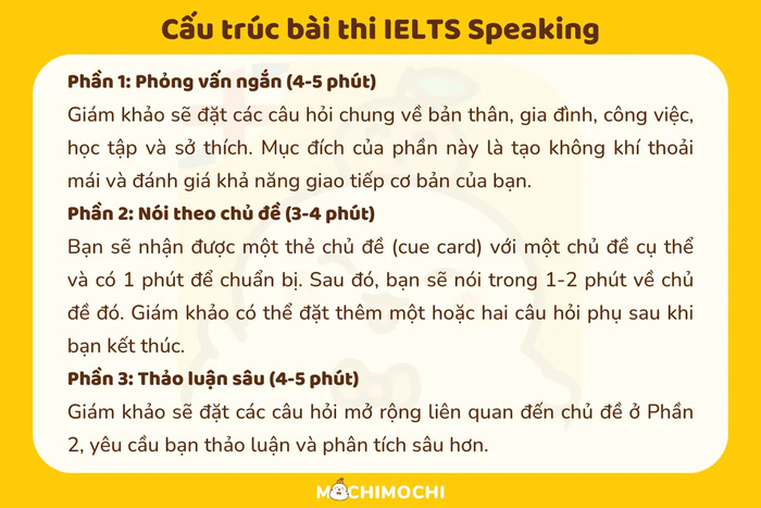 Phần thi IELTS Speaking kéo dài khoảng 11 đến 14 phút, được thiết kế nhằm đánh giá khả năng giao tiếp bằng tiếng Anh trong môi trường đối thoại thực tế. Bài thi được chia thành 3 phần chính, mỗi phần có mục đích và hình thức riêng biệt: