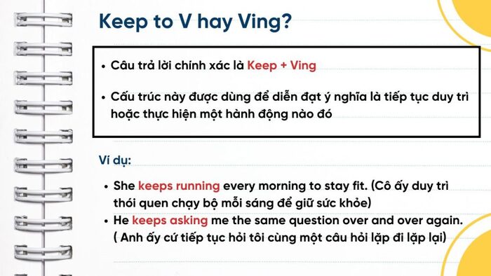 Khi nói đến keep V-ing hay to V, trước tiên cần hiểu rằng “keep” bản thân nó thường đi kèm với dạng V-ing để diễn tả hành động được duy trì, lặp lại hoặc kéo dài; ví dụ như “keep studying” (tiếp tục học), “keep smiling” (cứ mỉm cười). Trong khi đó, to V lại mang sắc thái hướng về một mục tiêu hoặc một hành động sẽ thực hiện trong tương lai; ví dụ “decide to study” (quyết định học), “plan to travel” (lên kế hoạch đi du lịch).