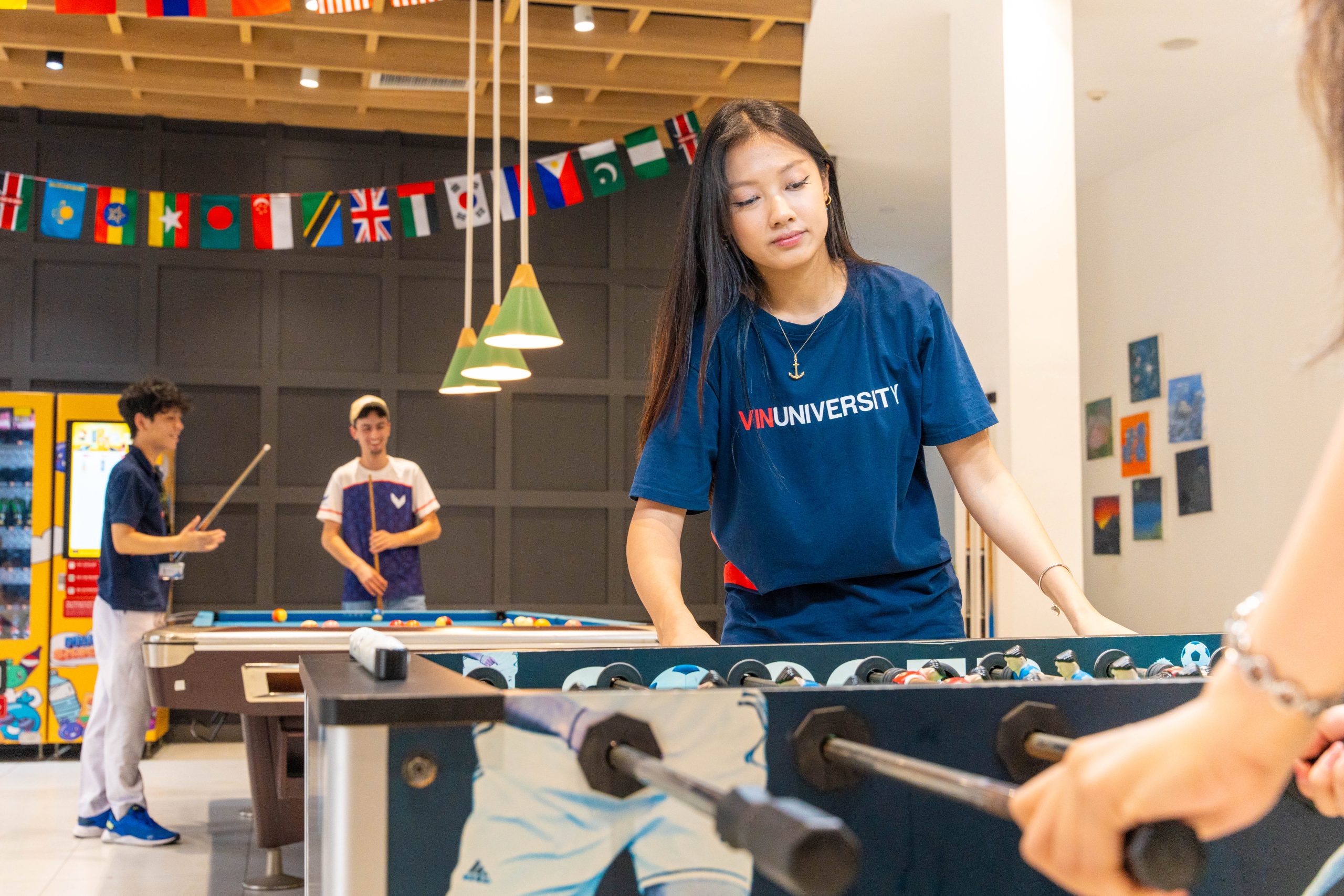 Tại VinUni, việc kết nối với các sinh viên khác trong ký túc xá được thúc đẩy thông qua các khu vực chung. Những không gian này được thiết kế để sinh viên có thể dành thời gian chất lượng cùng nhau, trò chuyện và gắn kết trong cuộc sống hàng ngày. Các không gian chung ở JA và JB, nằm ở tầng 1, được trang bị các trò chơi thú vị, mang đến cho sinh viên trải nghiệm vui vẻ và thư giãn để tận hưởng giờ giải lao cùng bạn bè.